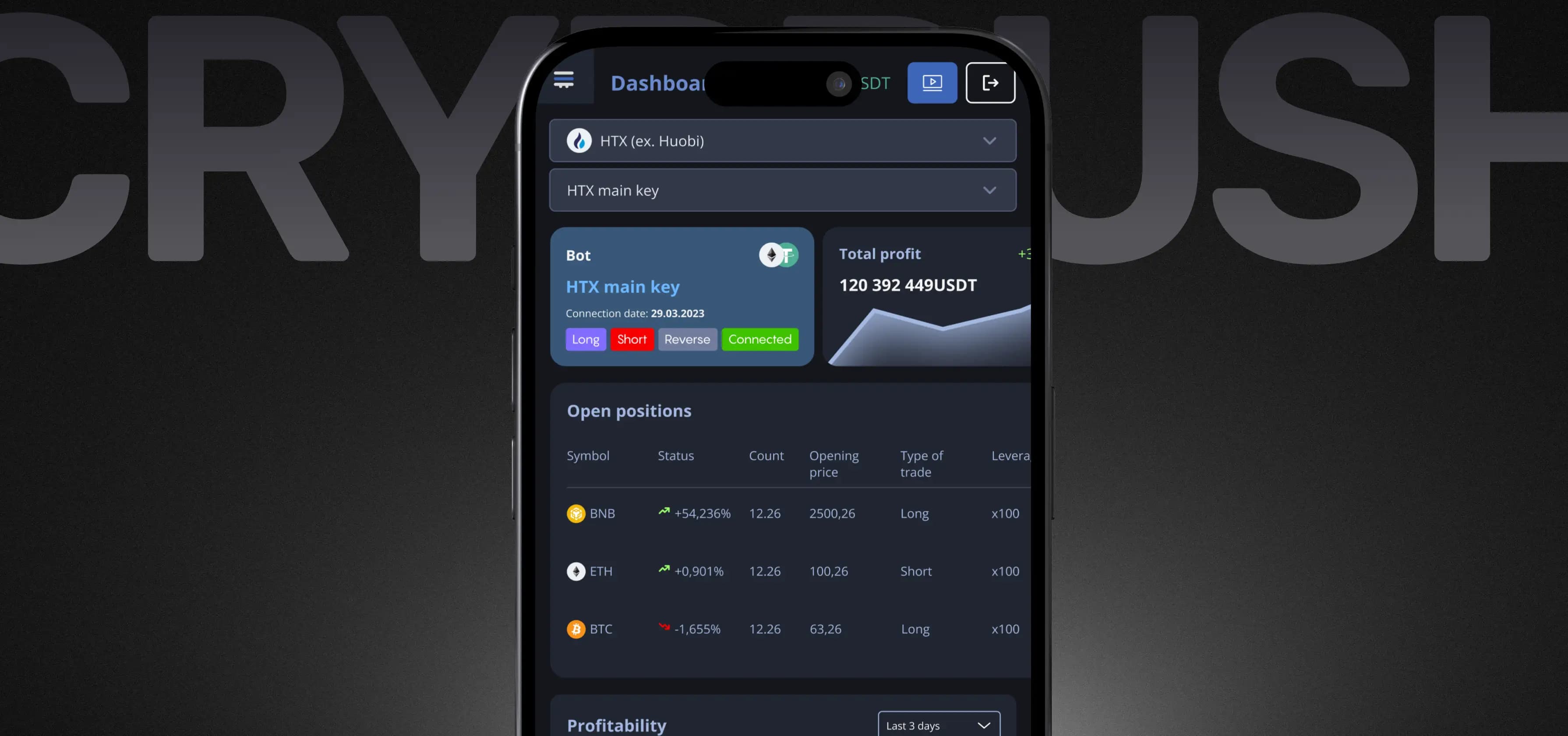 Secure connection to crypto exchanges without the need to transfer cryptocurrency, personal settings, algorithms and indicators that instantly react to the market situation
